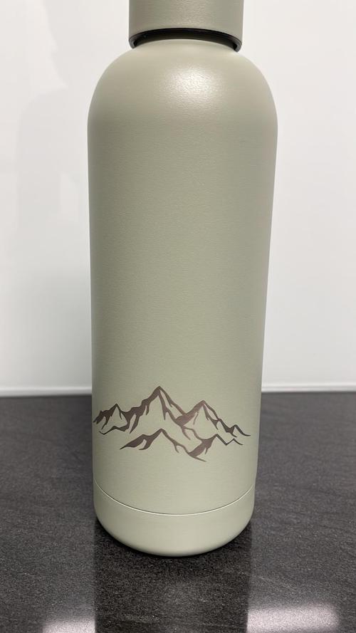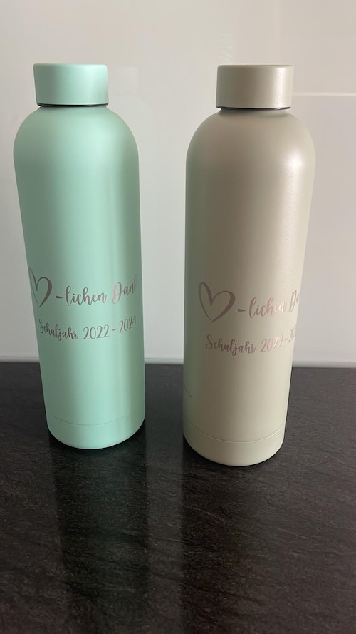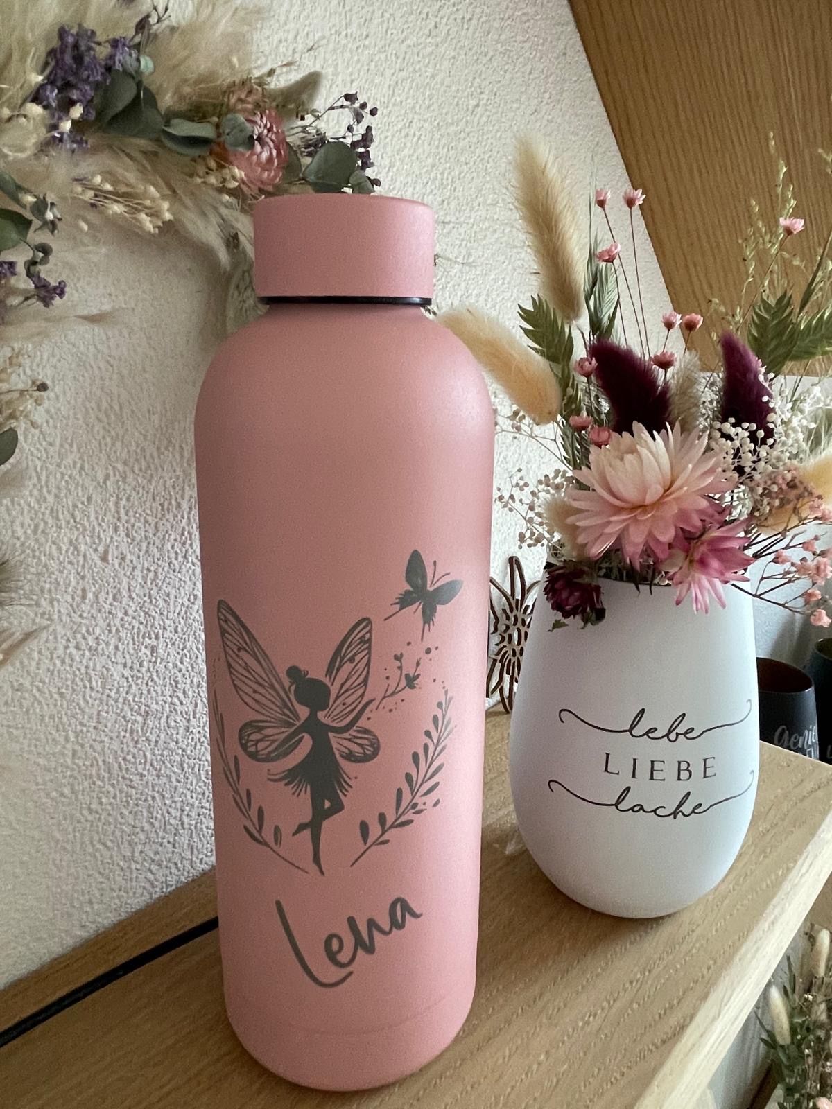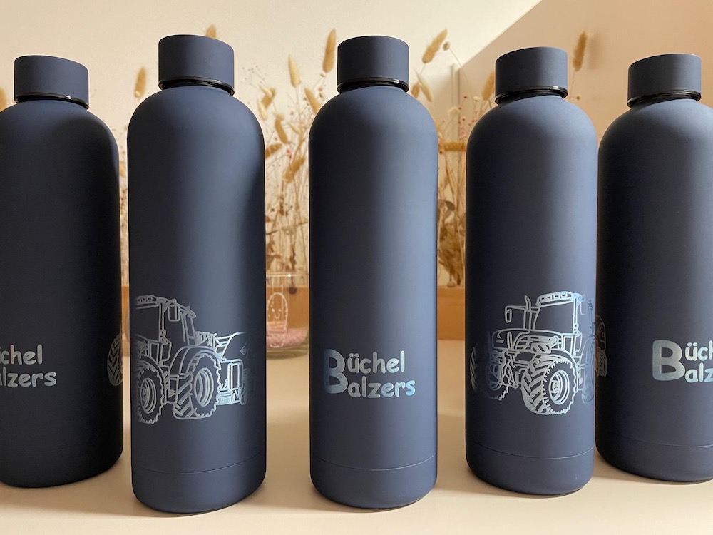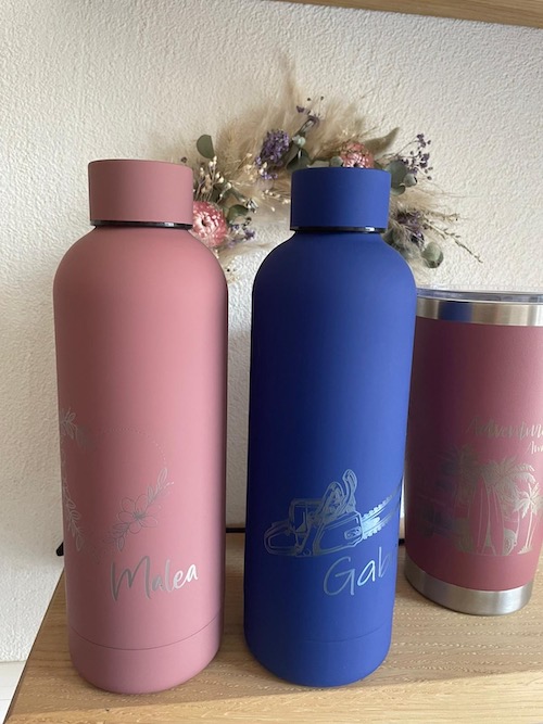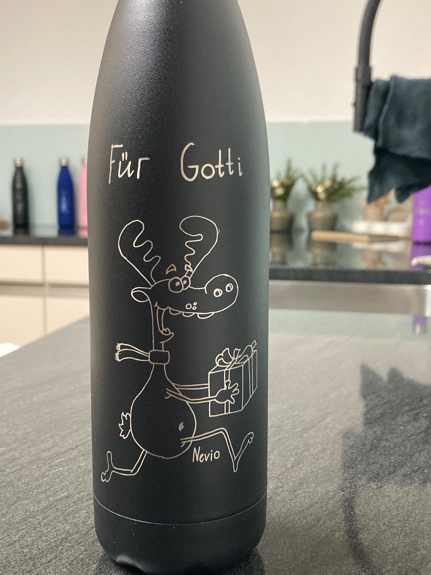 Persönliche Zeichnung von einem Kind, gelasert auf eine Trinkflasche für einen Paten als Überraschungsgeschenk. Diese Motive sind auch